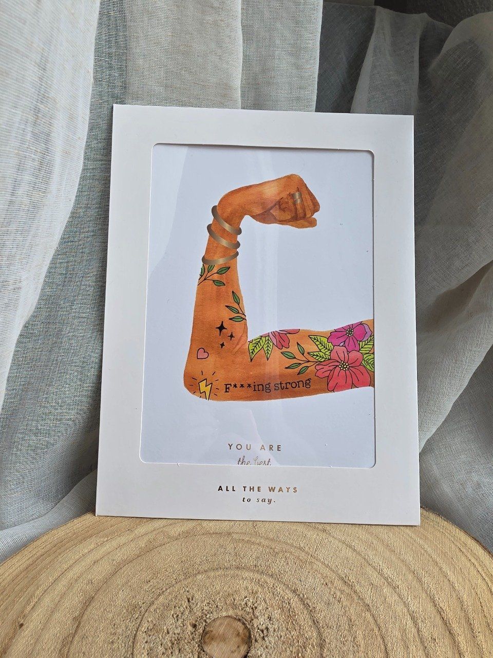 Affiche artistique 18 × 24 cm représentant le bras tatoué d’une femme. Illustration à l’aquarelle imprimée sur papier mat 200 g, envoyée à plat dans un emballage élégant aux détails dorés. Parfaite à offrir.
