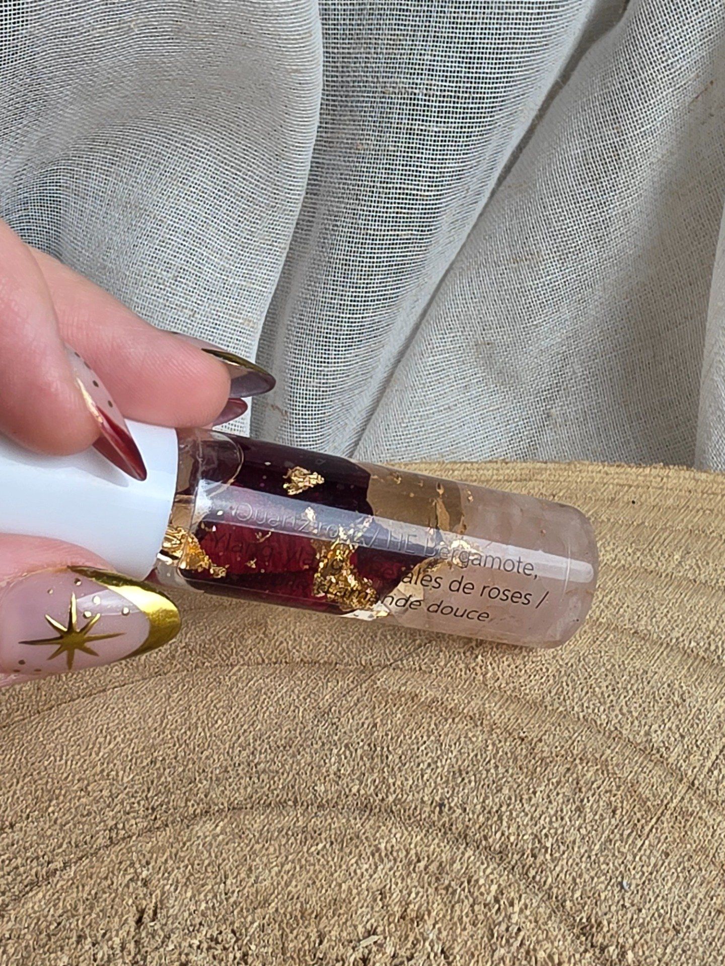 Roll-on Amour de soi – L’Alchimie de Maïlys. Synergie de quartz rose, pétales de roses, huiles végétales et essentielles pour favoriser la confiance, la sensualité et la reconnexion à soi. Rituel féminin à appliquer sur les points d’énergie.